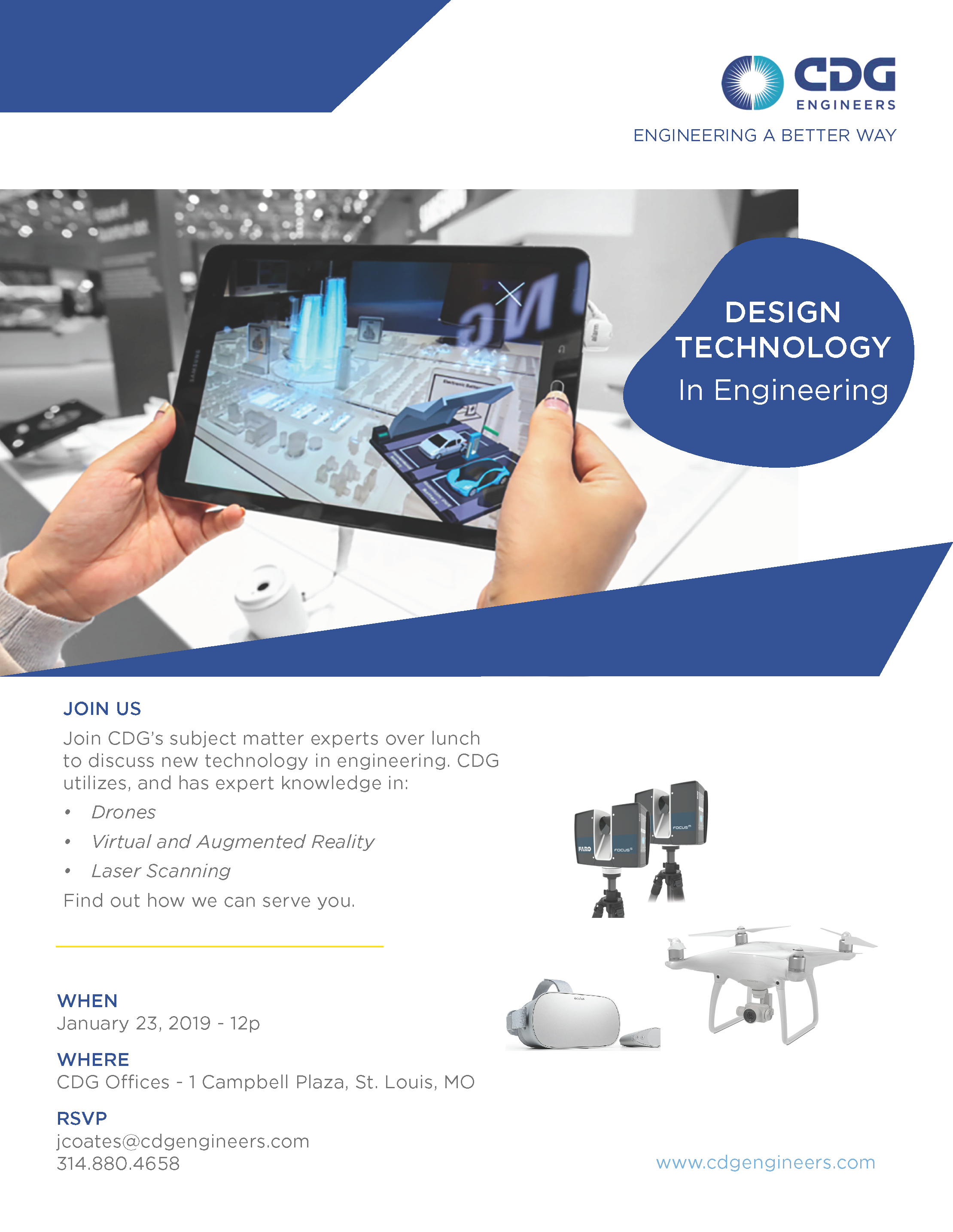 Join our team of experts on January 23rd to discuss new technologies in engineering and how CDG is engineering a better way. Further details can be found at https://bit.ly/2RGsbH4 or by contacting Jason Coates at jcoates@cdgengineers.com. We hope to see you there!